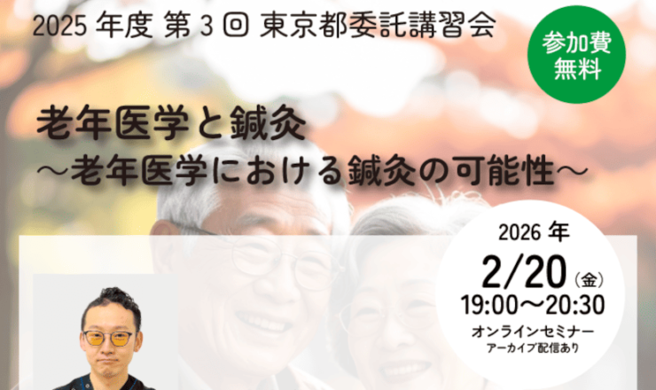 2026年02月20日(金) 19:00 〜 20:30 第3回東京都委託講習会 「老年医学と鍼灸 ~老年医学における鍼灸の可...