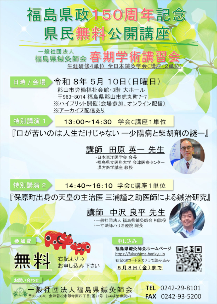 | 講習会 | 福島県政150週年記念 県民無料公開講座 一般社団法人 福島県鍼灸師会 春期学術講習会 |