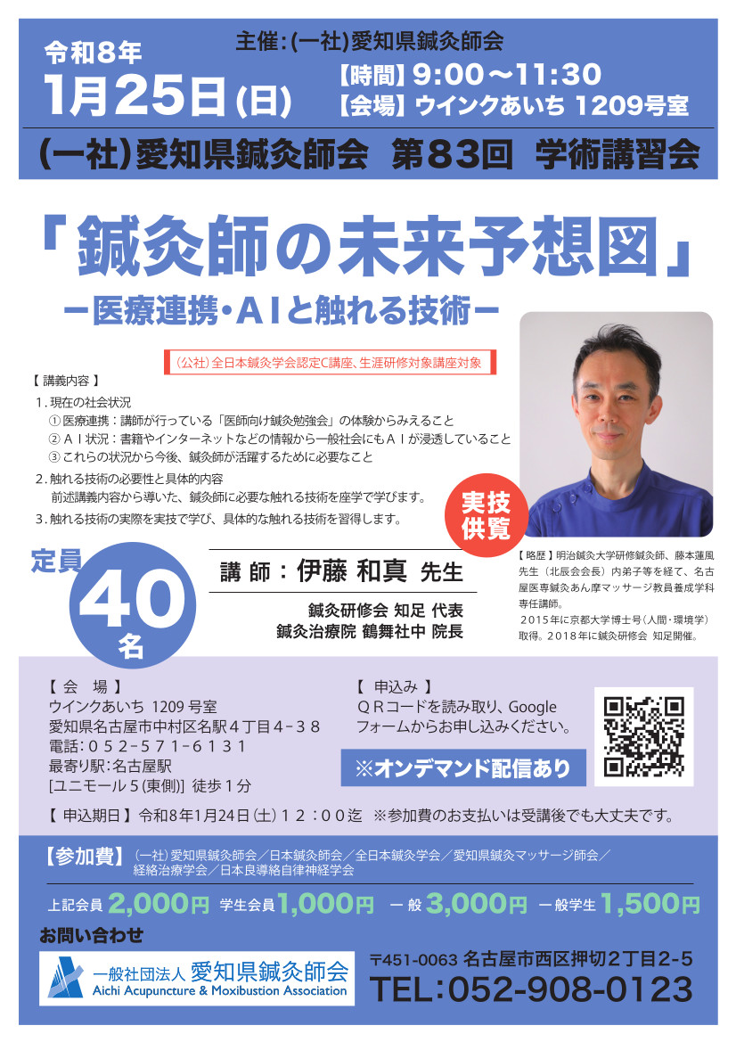 | 講習会 | (一社)愛知県鍼灸師会 第83回学術講習会 |