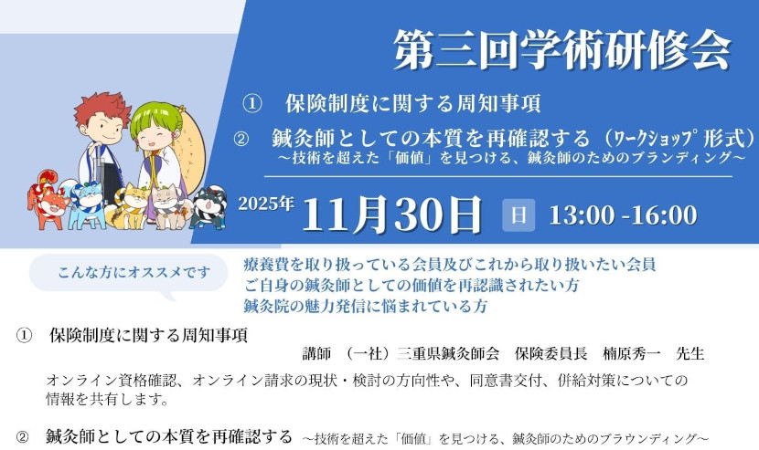 | 講習会 | 令和7年度第3回学術研修会 『保険制度に関する周知事項と鍼灸師としての本質を再確認する』 |